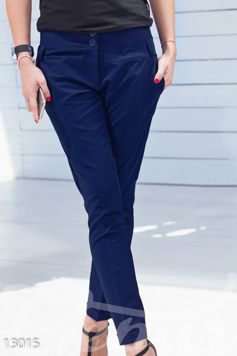 Зауженные брюки 7/8, выполненные из хлопковой ткани: средняя посадка, пояс с петлями-шлевками, два прорезных кармана по бокам и два кармана-обманки сзади.