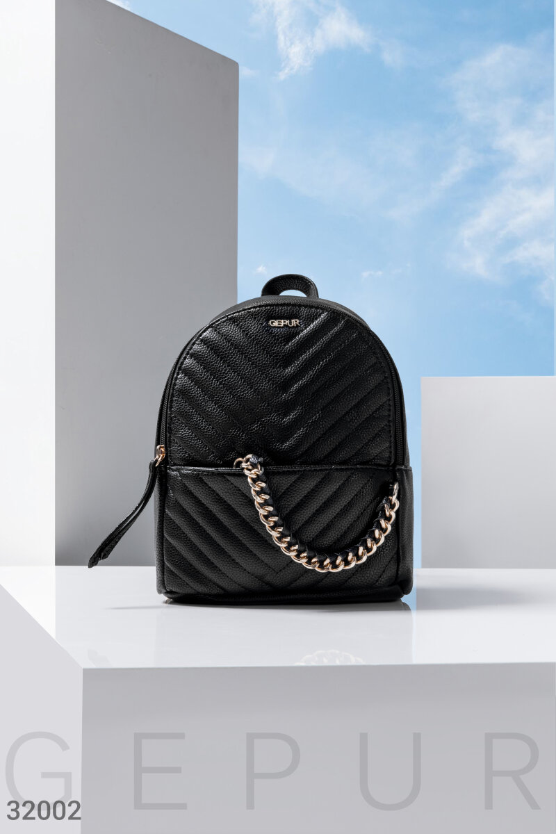 Небольшой городской рюкзак: удобная ручка, круговая застежка-молния, тонкие регулируемые лямки с вставкой-цепочкой, большой горизонтальный карман на молнии спереди, дополненный массивной золотистой цепью.