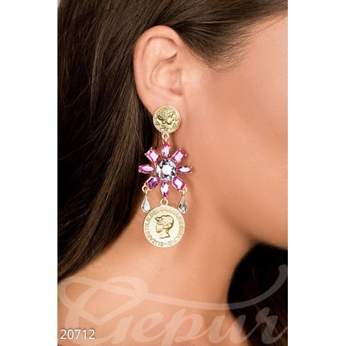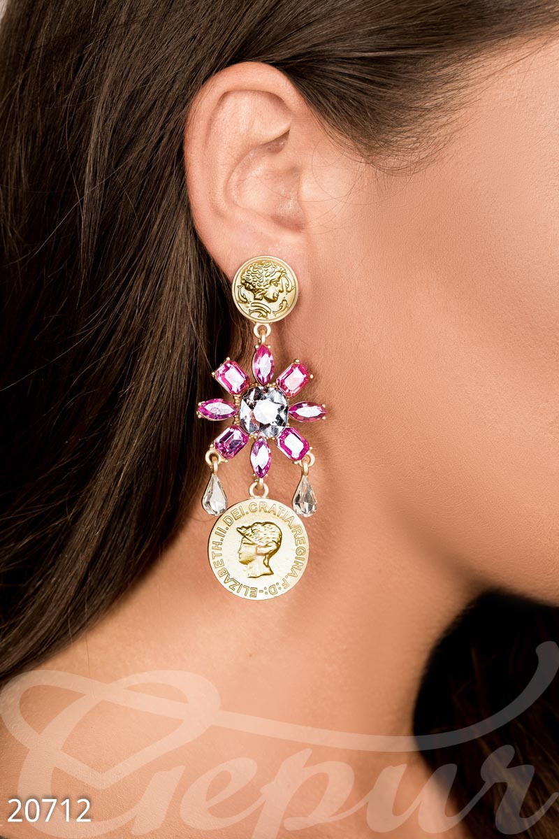 Серьги-подвески с камнями в форме ярких цветов и декоративными монетками.