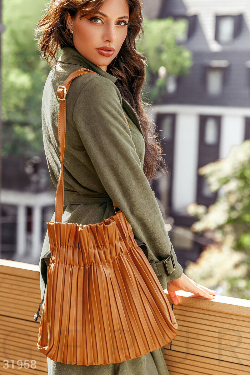 Коричневая в декоративную складку: затяжки по бокам, отстегивающийся регулируемый ремешок, одно вместительное отделение с боковым карманом на молнии и двумя открытыми.