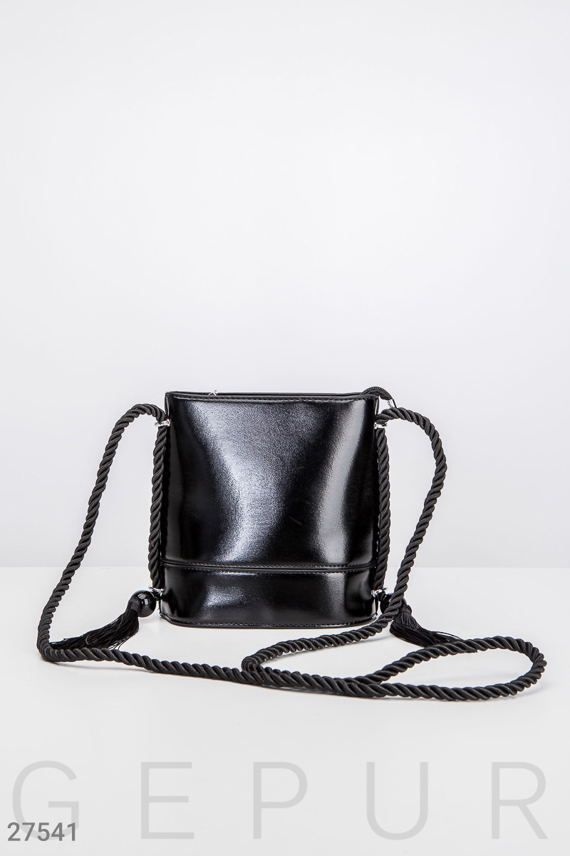 Небольшая женская сумка-бочонок из эко-кожи с перламутровым напылением, украшенная длинным ремешком-канатом.