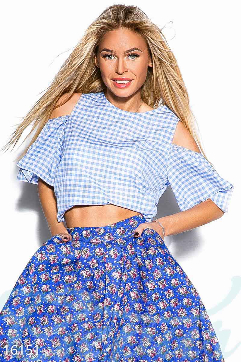 Укороченная летняя блуза из хлопковой ткани: короткий рукав-клеш с глубокими вырезами на плечах, небольшой разрез с застежкой на пуговицу и оригинальные завязки на спинке.