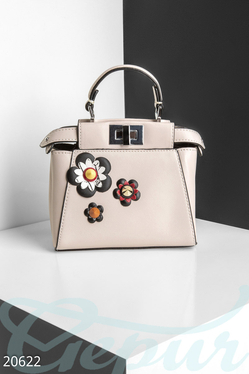 Оригинальная двусторонняя сумка для летнего периода, созданная из качественной эко-кожи, с короткой ручкой, объемной аппликацией "Цветы" и дополнительным плечевым ремешком.