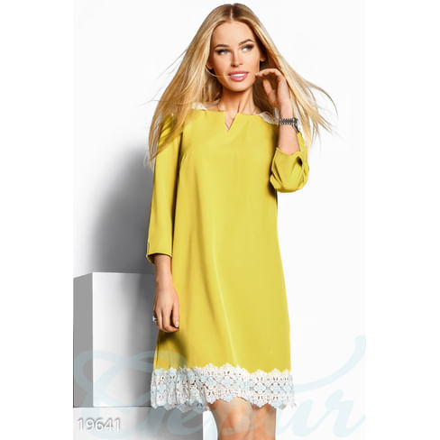 Короткое платье-трапеция с небольшим v-образным вырезом на груди, лаконичным рукавом 3/4 и отделкой контрастным тканным кружевом на плечах и подоле.