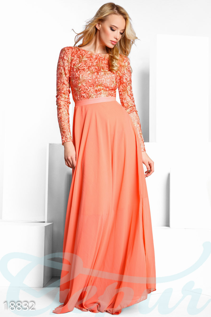 Изящное вечернее платье из комбинированной ткани: лаконичная кокетка, v-образный вырез на спинке и длинный рукав, выполненные из сетки с вышивкой, узкий втачной пояс и длинная шифоновая юбка-клеш.