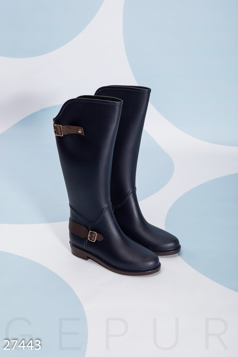 Стильные резиновые сапоги-жокей с контрастной пряжкой, предназначенные для дождливой погоды.