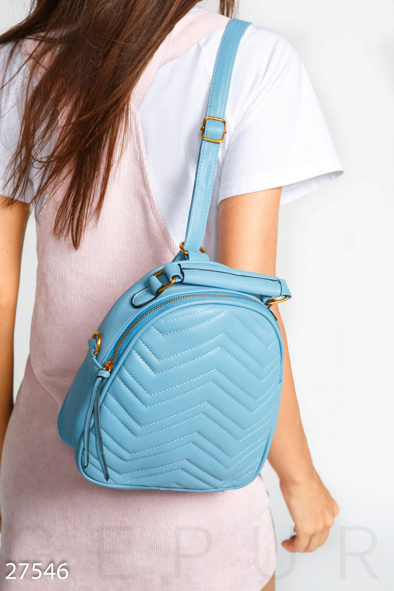 Небольшой женский рюкзак на молнии, выполненный из стеганой эко-кожи. Лямки трансформируются в плечевой ремешок с регулятором длины.