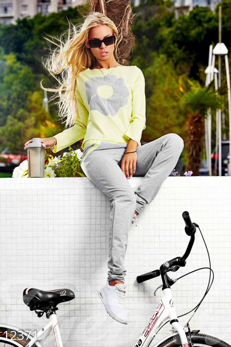 Комфортный тренировочный костюм, выполненный из плотной трикотажной ткани: свободная туника асимметричного кроя с фигурным вырезом-лодочка, длинным рукавом без манжет и контрастным накатом «цветок» на груди брюки средней посадки с двумя карманами.