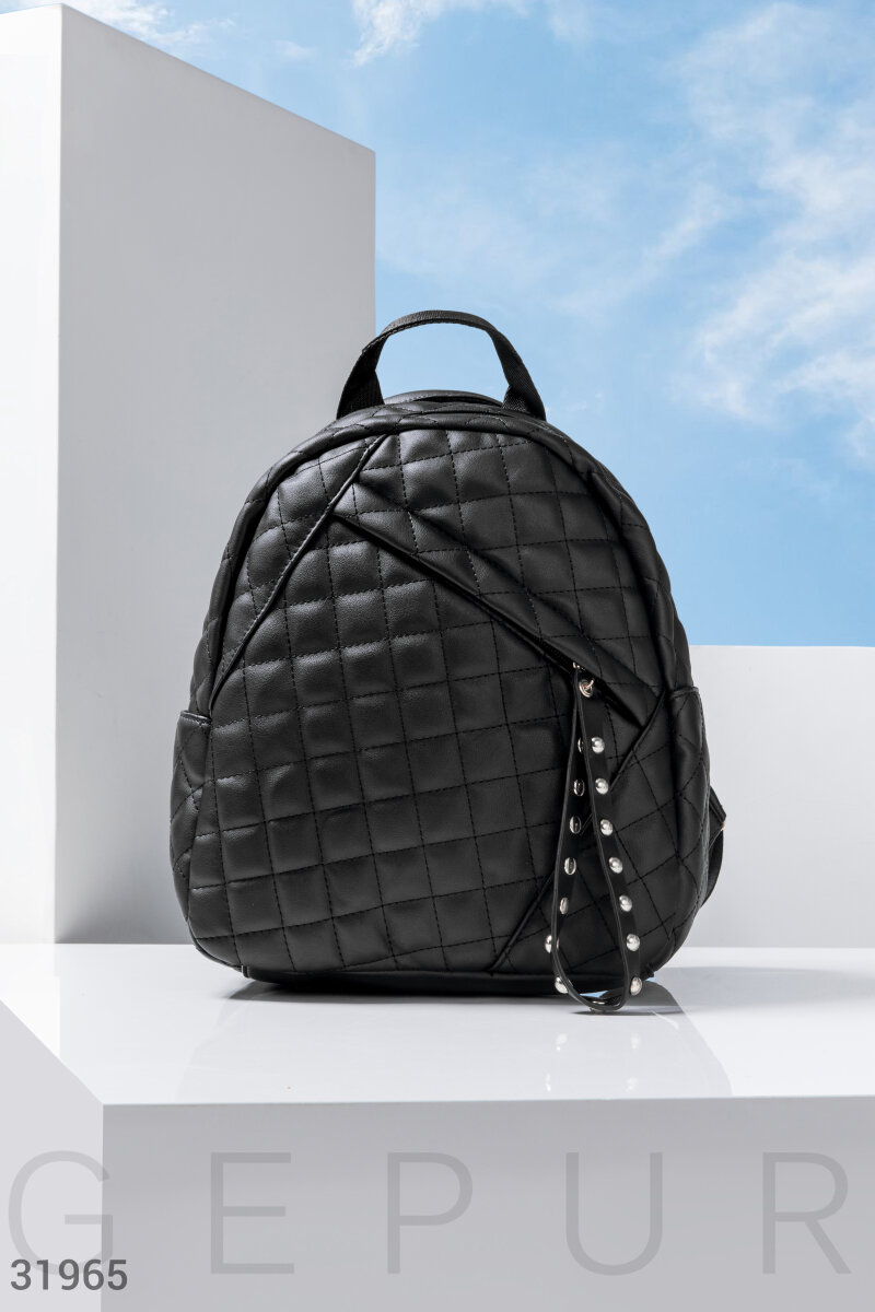 Трендовый стеганый рюкзак с короткой ручкой и регулируемыми плечевыми ремешками: один вместительный отдел с боковым карманом на молнии и двумя открытыми, снаружи дополнен асимметричным небольшим карманом с заклепками.