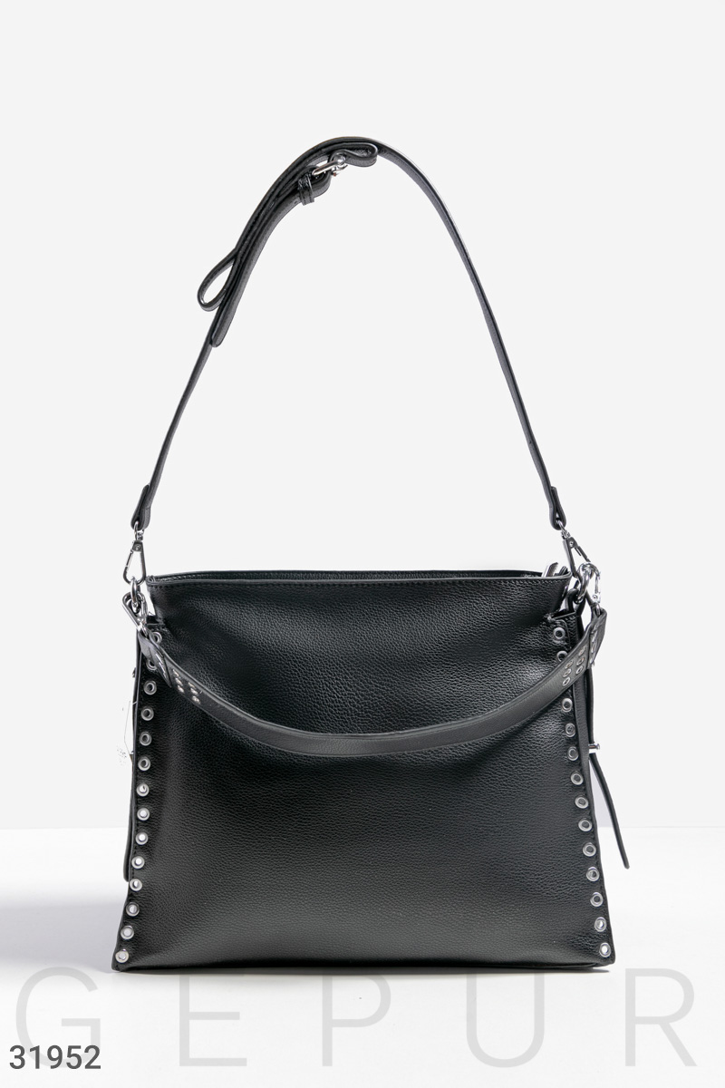 Трендовая черная сумка на молнии с перфорацией и небольшими кнопками по бокам, короткой отстегивающейся ручкой и длинной лямкой: одно вместительное отделение с боковым карманом на молнии и двумя открытыми. ,