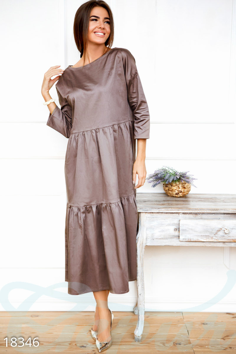 Стильное хлопковое платье свободного кроя с аккуратным вырезом-лодочка, заниженной линией плеча, прямым рукавом ¾, и длинной многоярусной юбкой.