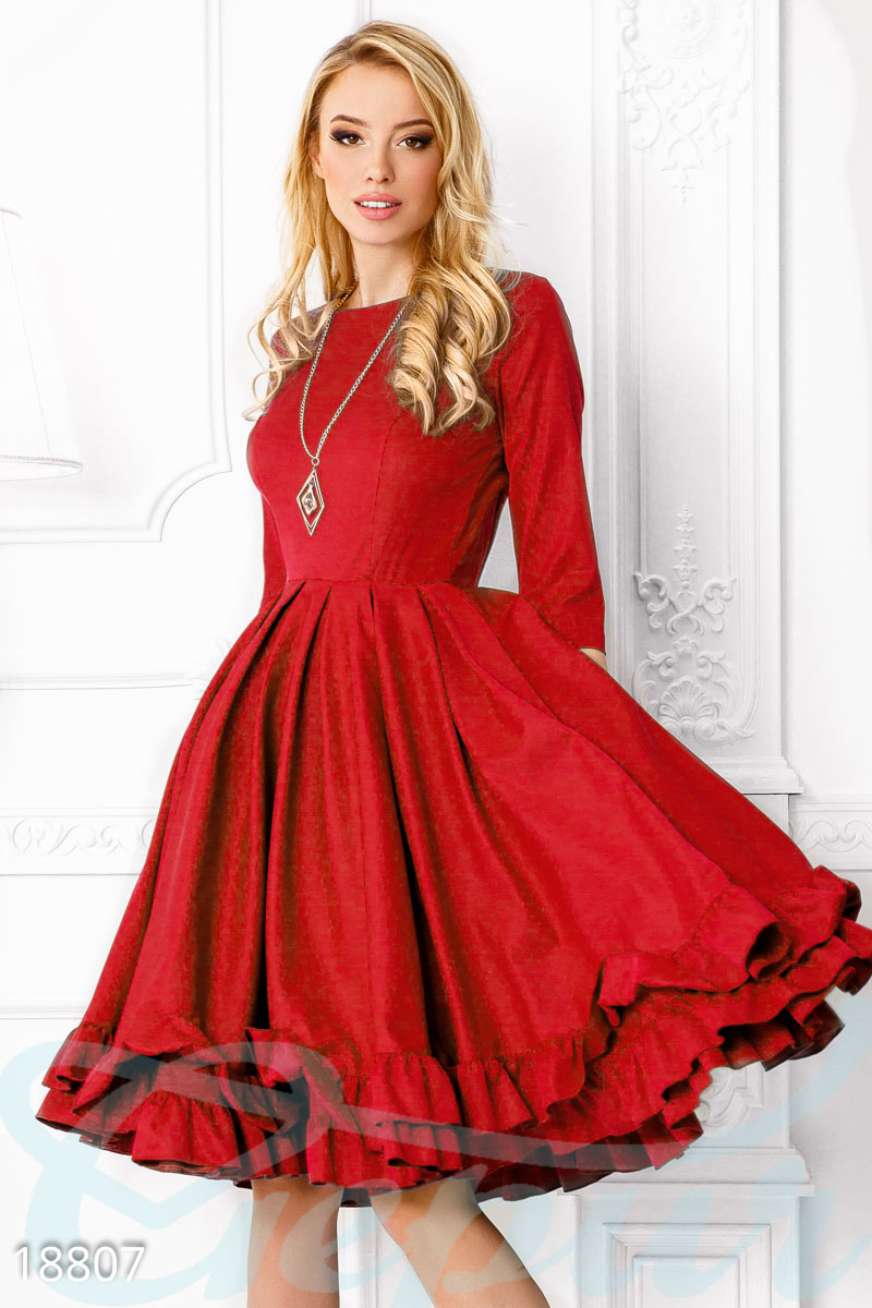 Стильное платье А-силуэта с аккуратным круглым вырезом, лаконичным рукавом ¾ и пышной двухслойной юбкой, украшенной оборками. В комплект входит съемная подвеска с кулоном.